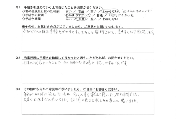 何から手を付ければ良いのか分からない状態から、何をどのように進めていけば手続きを終わらせることができるのかが目に見えて分かり、実際に行ってもらえたので安心しました。