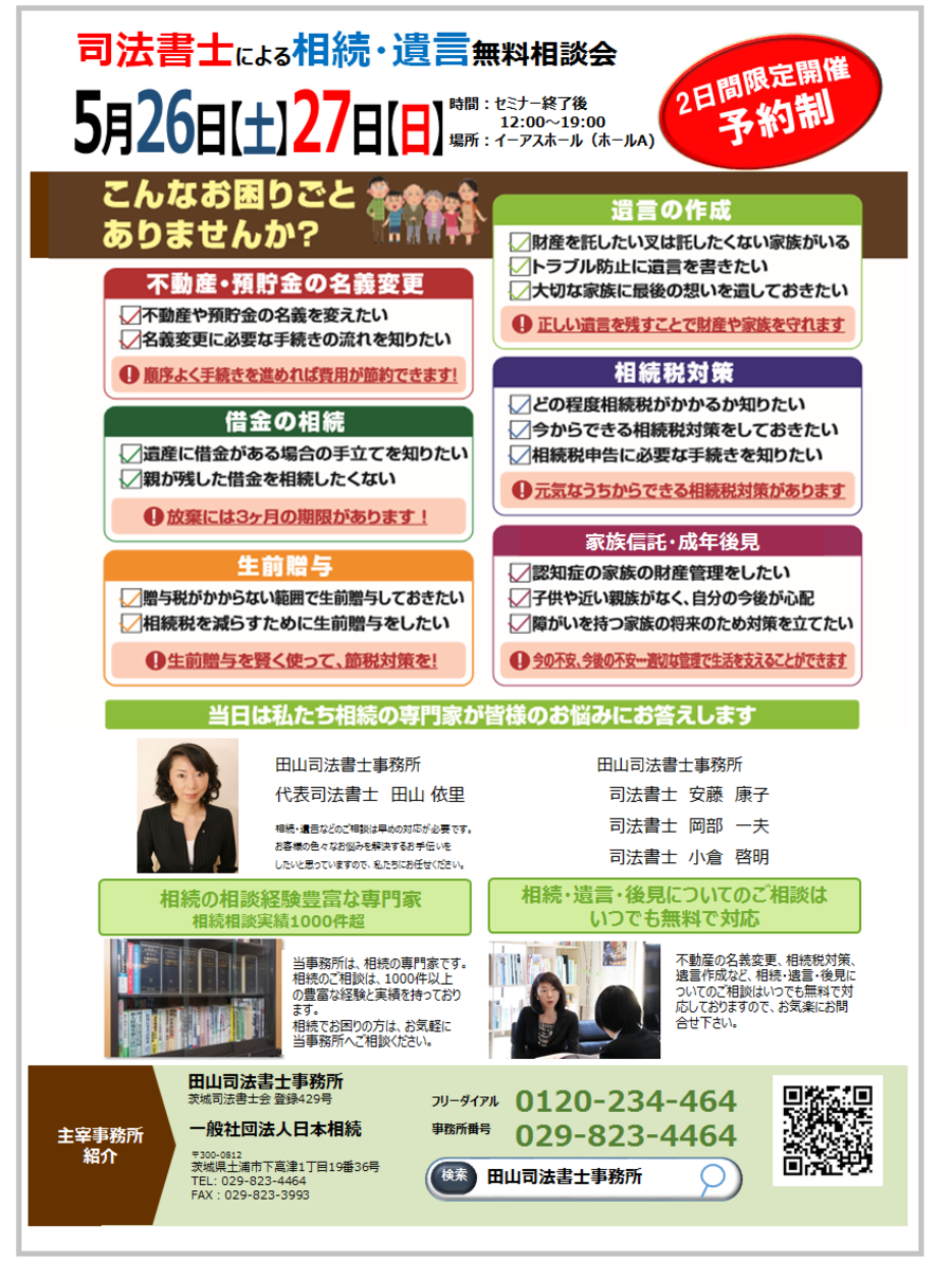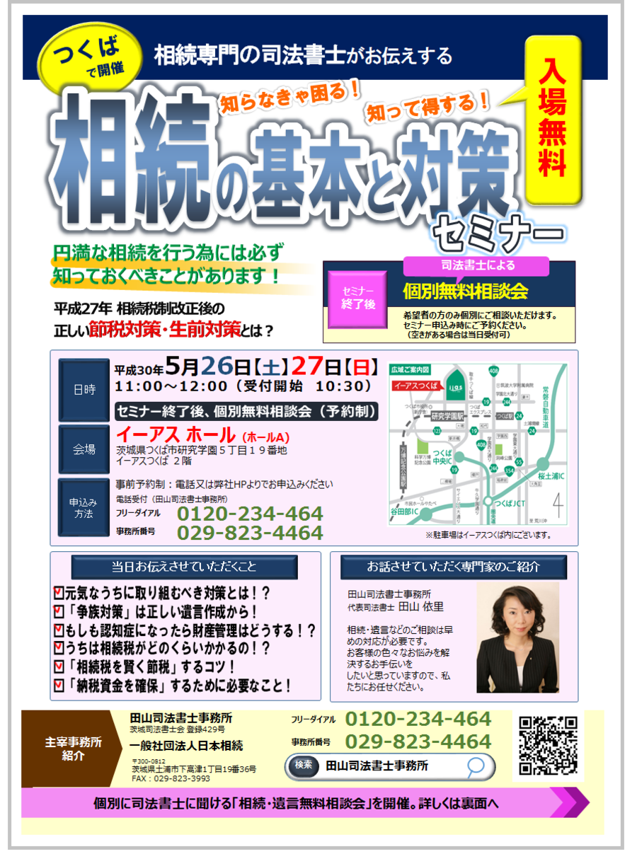 2018年5月26日【相続の基本と対策セミナー】【無料ご別相談会】より