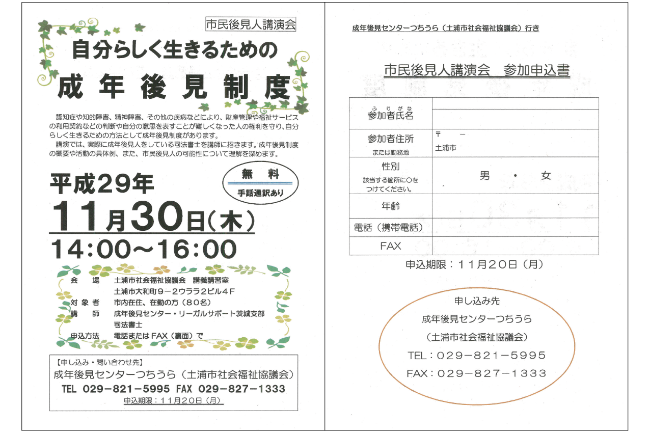 当事務所では相続についてご相談おまちしております。フリーダイアル:0120-234-464 TEL: 029-823-4464 mail: info@acllas.co.jp お問い合わせフォーム 成年後見センターつちうら(土浦市社会福祉協議会)主催 [自分らしく生きるための成年後見制度] 平成29年11月30日木曜日 14:00~16:00 ウララ2ビル4Fにて開催されました。 講師:司法書士 安藤康子(田山司法書士事務所)